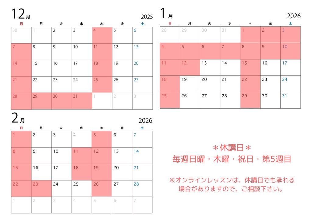 月曜日~金曜日 9:00~20:00(19:00スタートのレッスンが最後のクラスです) 土曜日 9:00~17:00(16:00スタートのレッスンが最後のクラスです) ※オンラインレッスンのみ夜20:00~のレッスンが最後のクラスになります。